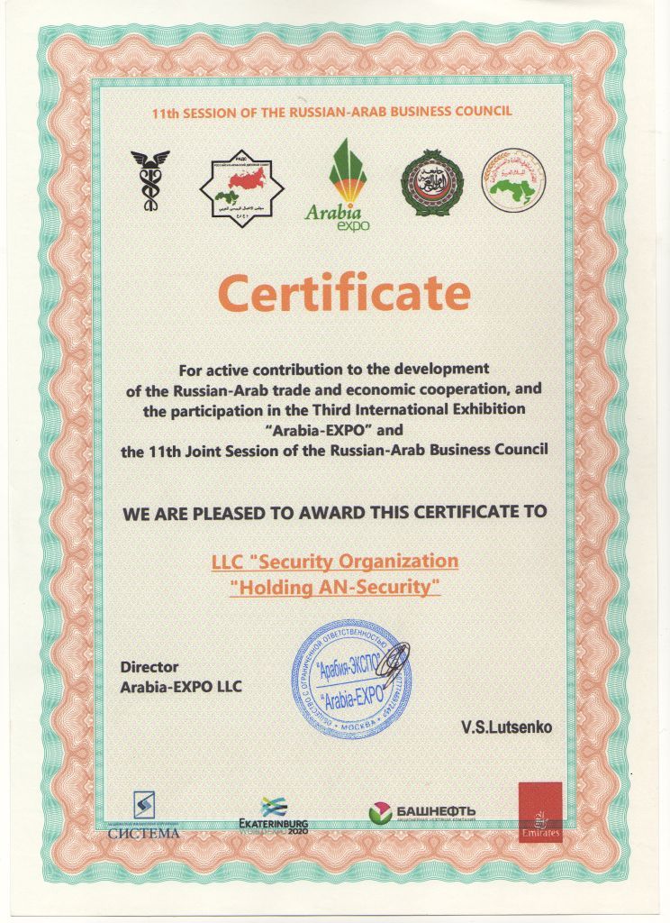новости2013-06-01 :: Холдинг "АН-Секьюрити" принял участие в выставке «Арабия-ЭКСПО» С 30 мая по 1 июня 2013г. в Санкт-Петербурге (ВК «Ленэкспо») при поддержке МИД РФ, Минэкономразвития и Минэнерго России, под эгидой ТПП РФ и Генерального союза палат торговли, промышленности и сельского хозяйства арабских стран состоялась Третья международная выставка «Арабия-ЭКСПО» и Одиннадцатая Сессия Российско-Арабского Делового Совета. Данное мероприятие проводилось с акцентом на межрегиональное сотрудничество и было призвано стать серьезной платформой для прямого общения российского и арабского бизнеса. Холдинг "АН-Секьюрити" принял активное участие в выставке и был отмечен сертификатом за активный вклад в развитие Российско-арабского сотрудничества.